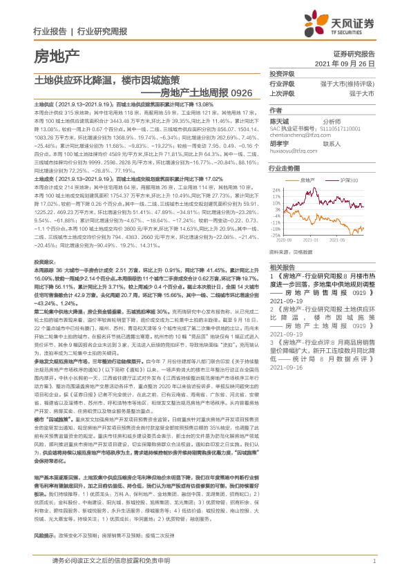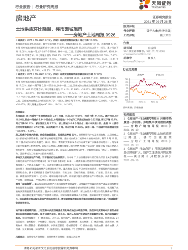 【天风证券】【20210926】房地产土地周报:土地供应环比降温,楼市因城施策-9页