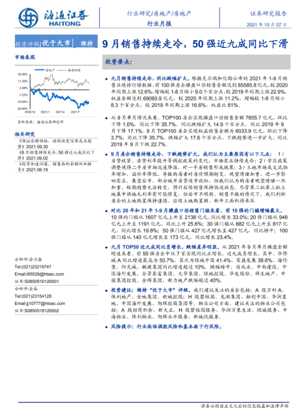 【海通证券】【20211007】房地产行业月报:9月销售持续走冷,50强近九成同比下滑-11页