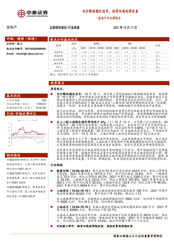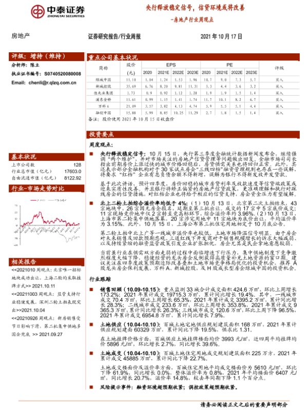 【中泰证券】【20211017】房地产行业周观点:央行释放稳定信号,信贷环境或将改善-11页