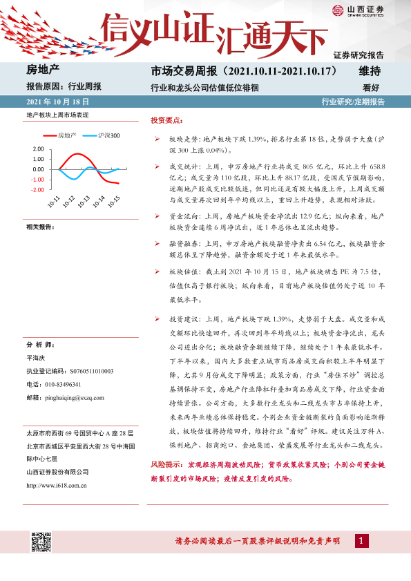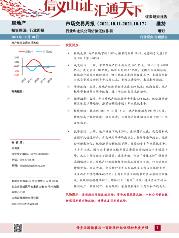 【山西证券】【20211018】房地产市场交易周报:行业和龙头公司估值低位徘徊-20页
