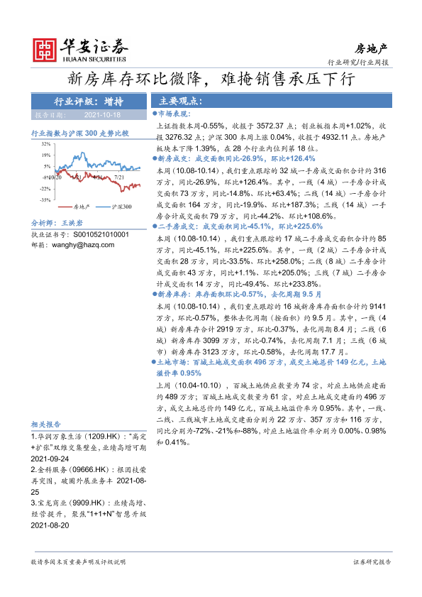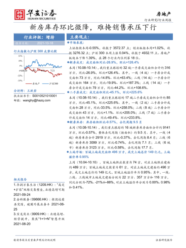 【华安证券】【20211018】房地产行业周报:新房库存环比微降,难掩销售承压下行-17页