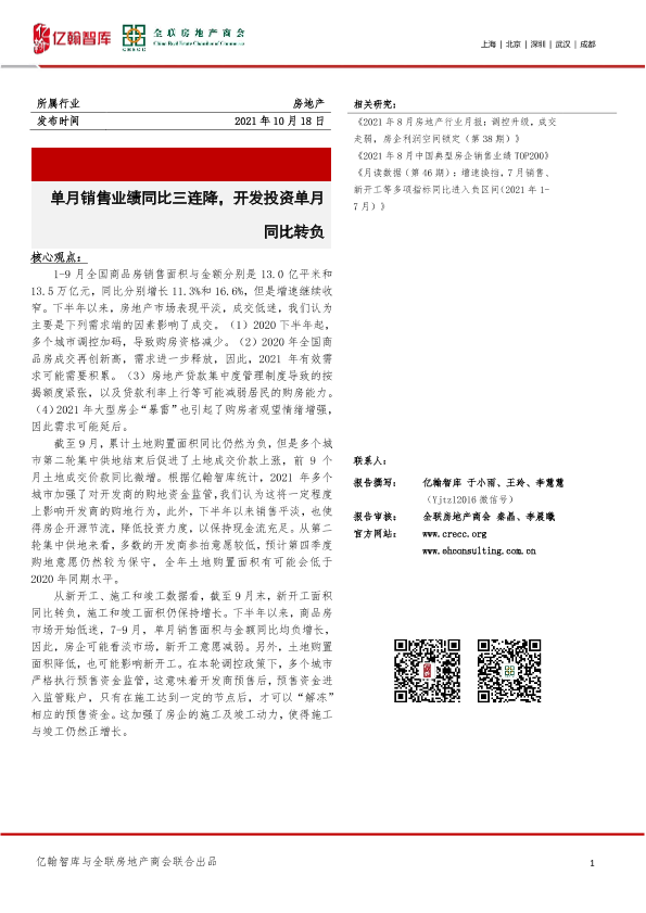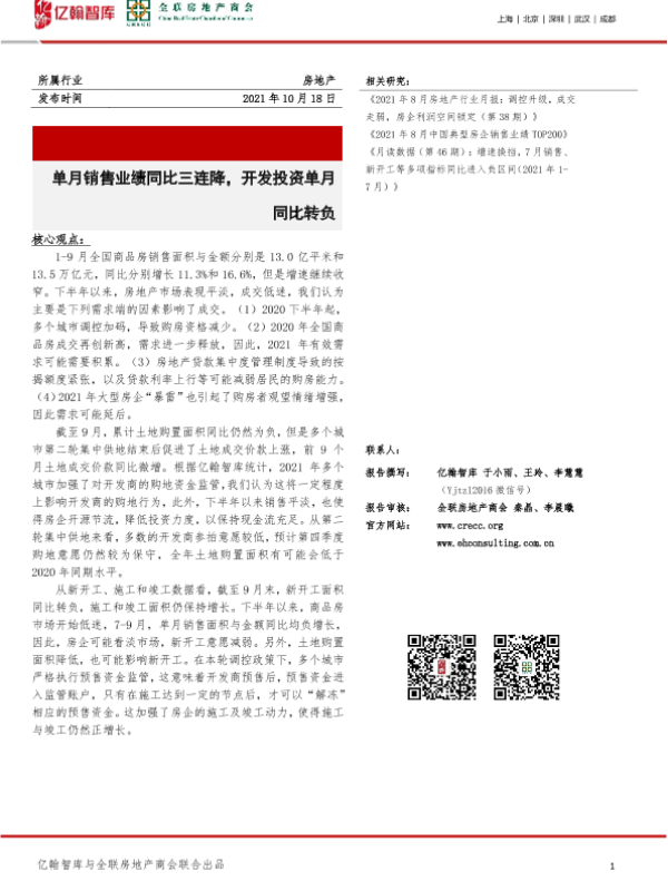 【亿翰智库与全联房地产商会】【20211018】单月销售业绩同比三连降,开发投资单月同比转负-10页