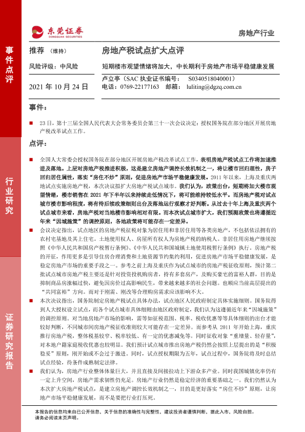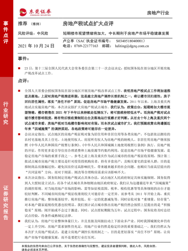 【东莞证券】【20211024】房地产税试点扩大点评:短期楼市观望情绪将加大,中长期利于房地产市场平稳健康发展-3页