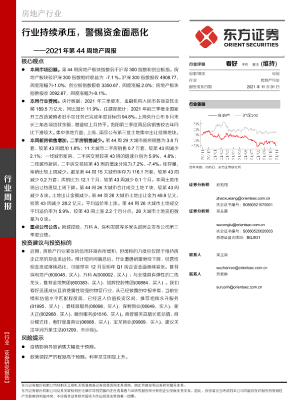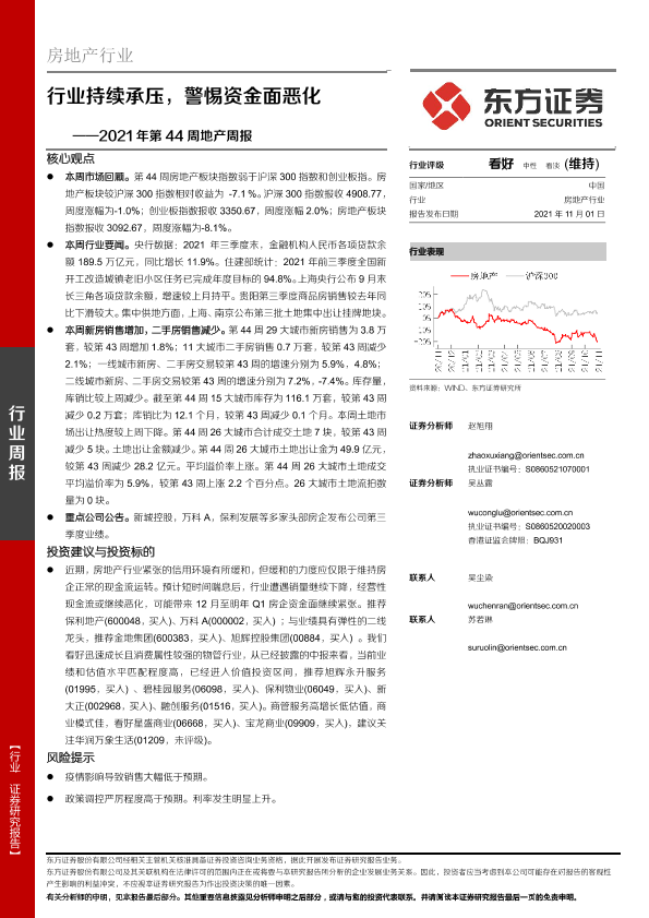 【东方证券】【20211101】2021年第44周地产周报:行业持续承压,警惕资金面恶化-18页