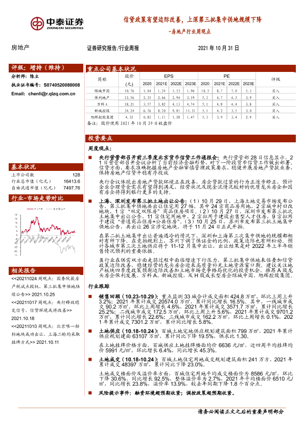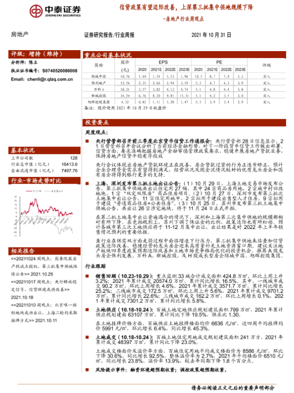 【中泰证券】【20211031】房地产行业周观点:信贷政策有望边际改善,上深第三批集中供地规模下降-11页