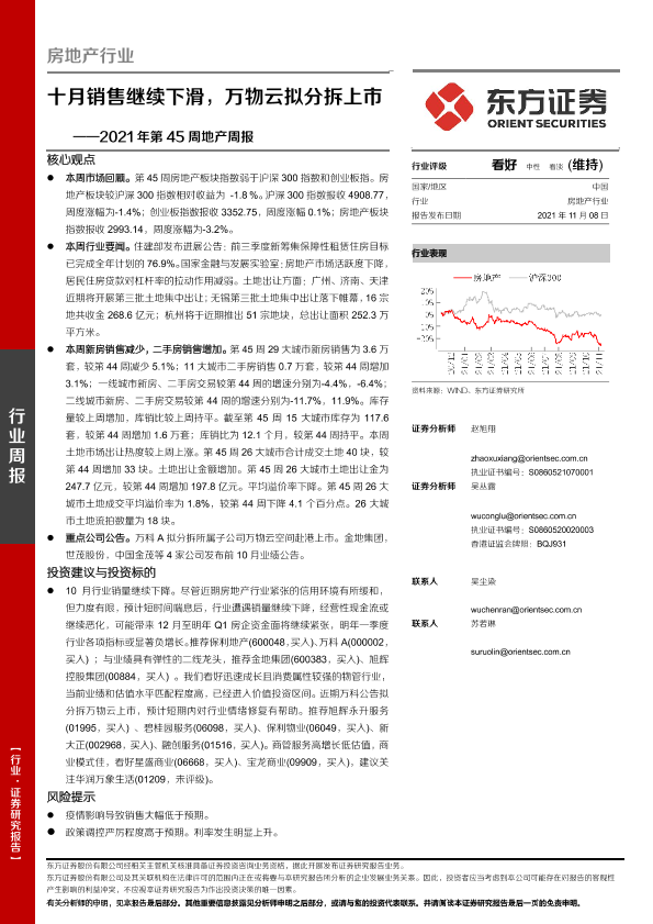 【东方证券】【20211108】房地产行业2021年第45周地产周报:十月销售继续下滑,万物云拟分拆上市-17页