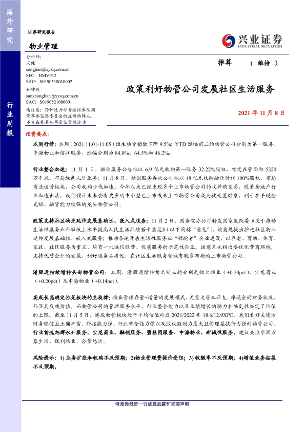 政策支持 港股通 物业管理 社区生活服务 行业整合