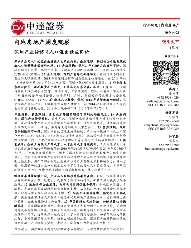 【中达证券】【20211110】内地房地产周度观察:深圳产业转移与人口溢出效应简析-15页