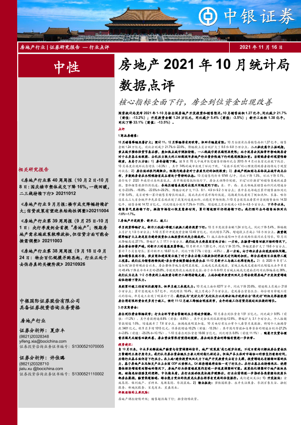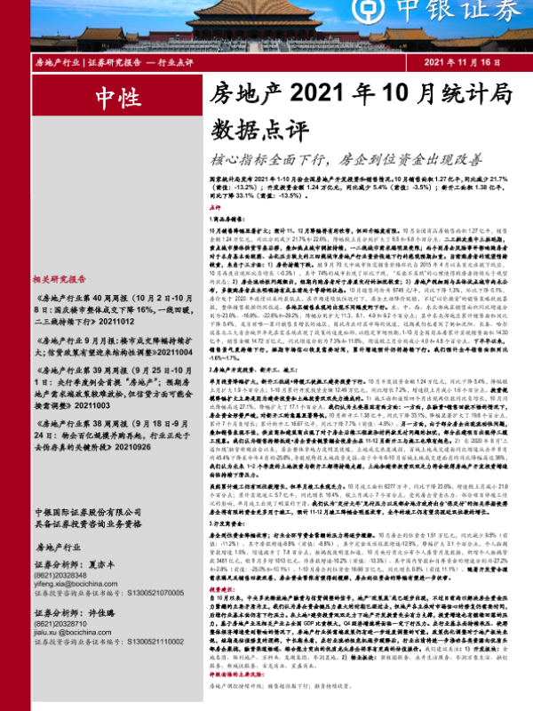 【中银证券】【20211116】房地产2021年10月统计局数据点评:核心指标全面下行,房企到位资金出现改善-6页