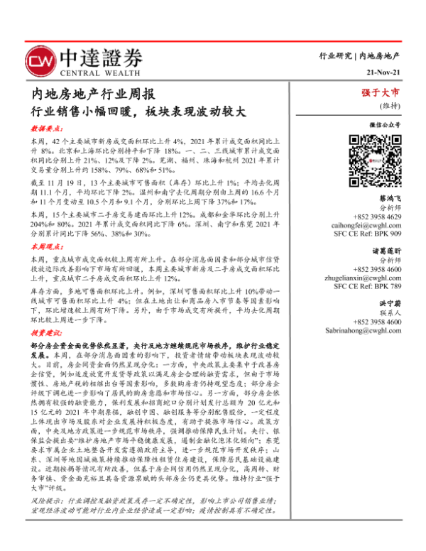 【中达证券】【20211121】内地房地产行业周报:行业销售小幅回暖,板块表现波动较大-12页