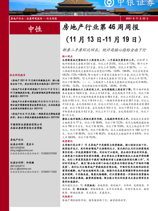 【中银证券】【20211122】房地产行业第46周周报:新房二手房环比回正;统计局核心指标全面下行-25页