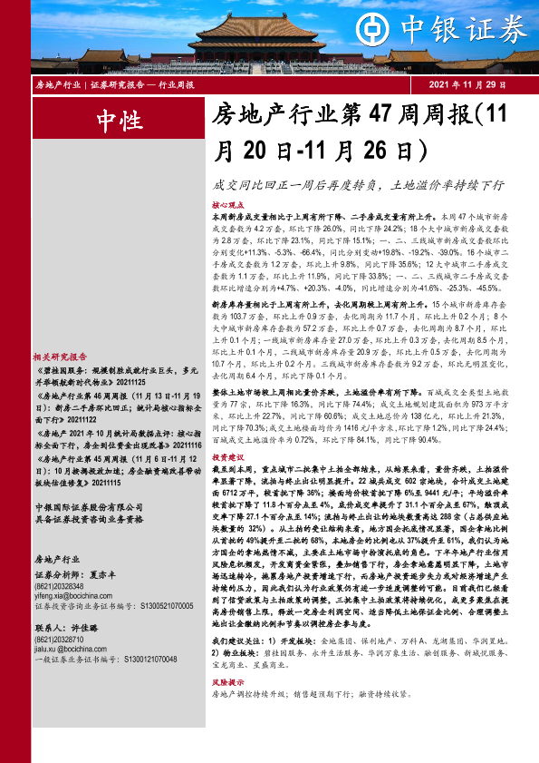 【中银证券】【20211129】成交同比回正一周后再度转负,土地溢价率持续下行-25页
