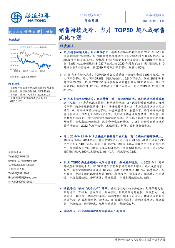 【海通证券】【20211201】房地产行业月报:销售持续走冷,当月TOP50超八成销售同比下滑-11页