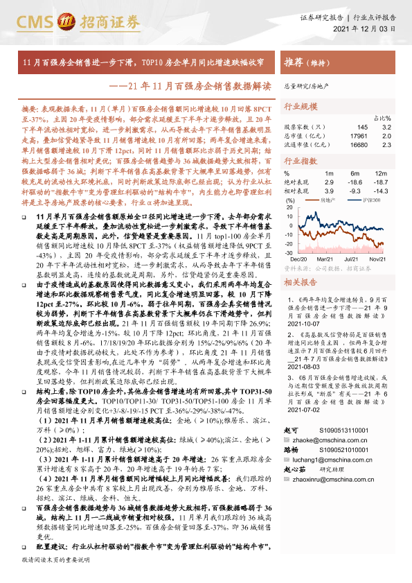 【海通证券】【20211203】21年11月百强房企销售数据解读:11月百强房企销售进一步下滑,TOP10房企单月同比增速跌幅收窄-3页