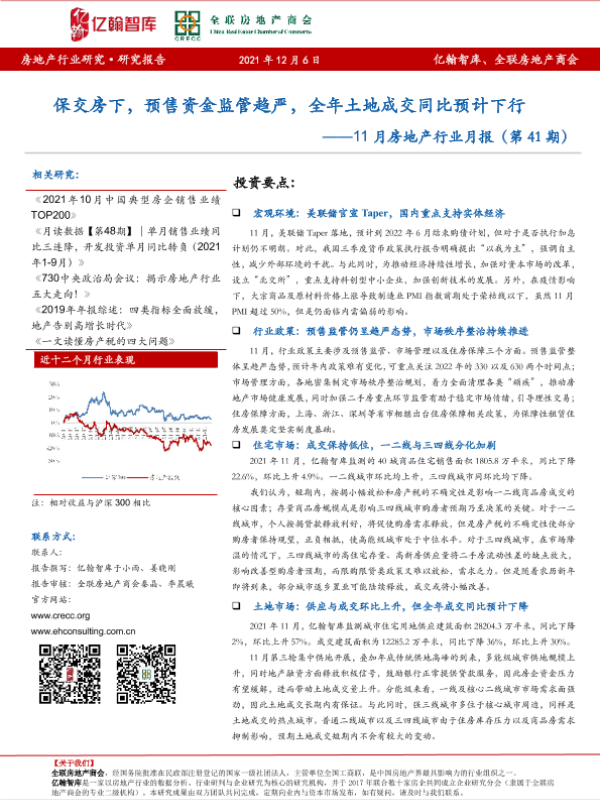 【亿翰智库】【20211206】11月房地产行业月报:保交房下,预售资金监管趋严,全年土地成交同比预计下行-29页