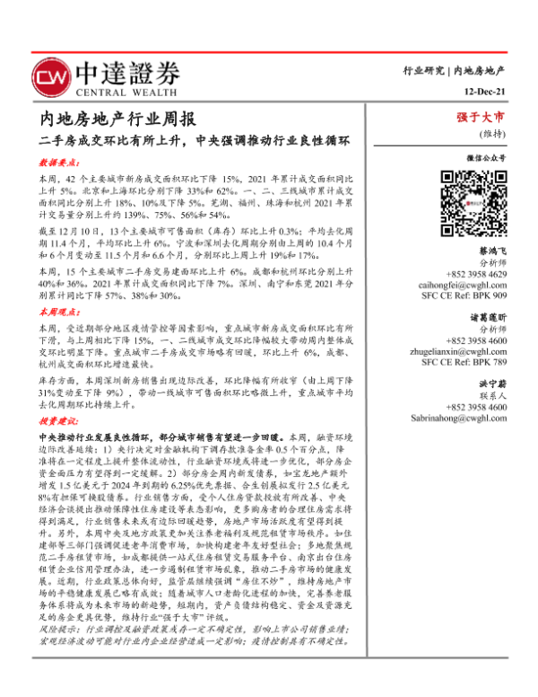 【中达证券】【20211212】内地房地产行业周报:二手房成交环比有所上升,中央强调推动行业良性循环-12页