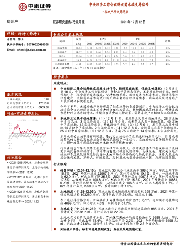 中央经济工作会议 土地市场 房地产政策 行业周报 需求端支持