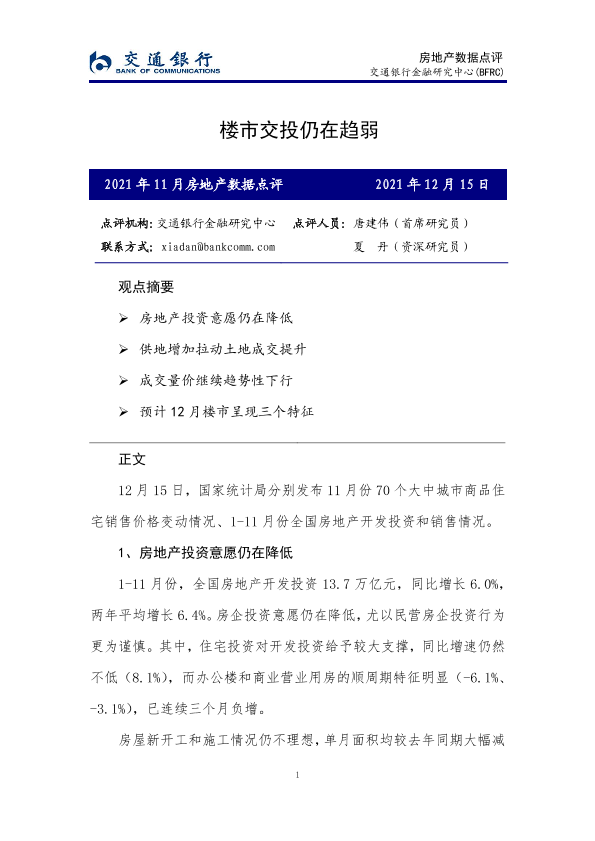 【交通银行金融研究中心】【20211215】2021年11月房地产数据点评:楼市交投仍在趋弱-5页