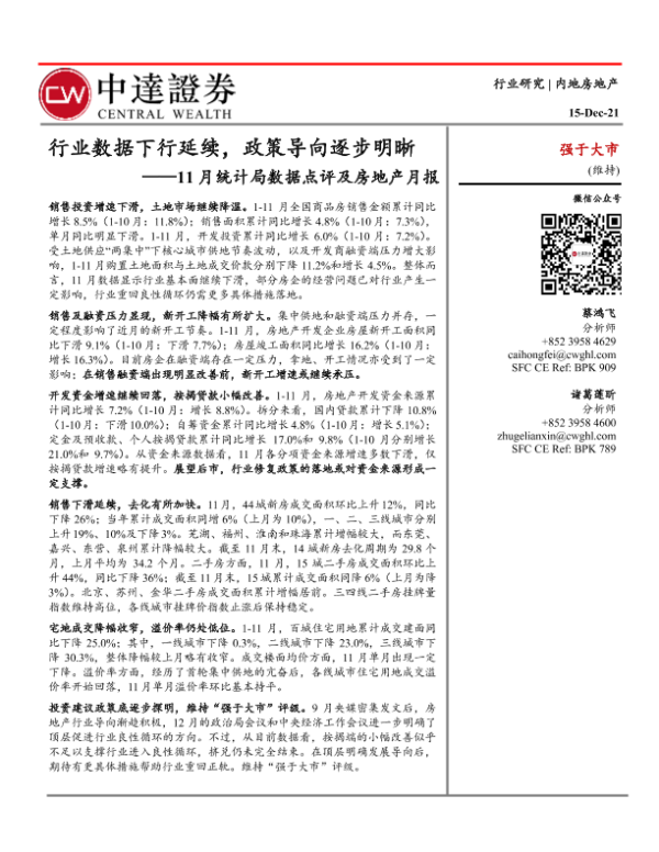 【中达证券】【20211215】11月统计局数据点评及房地产月报:行业数据下行延续,政策导向逐步明晰-26页