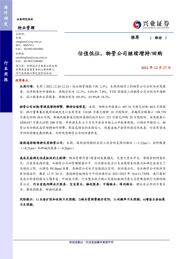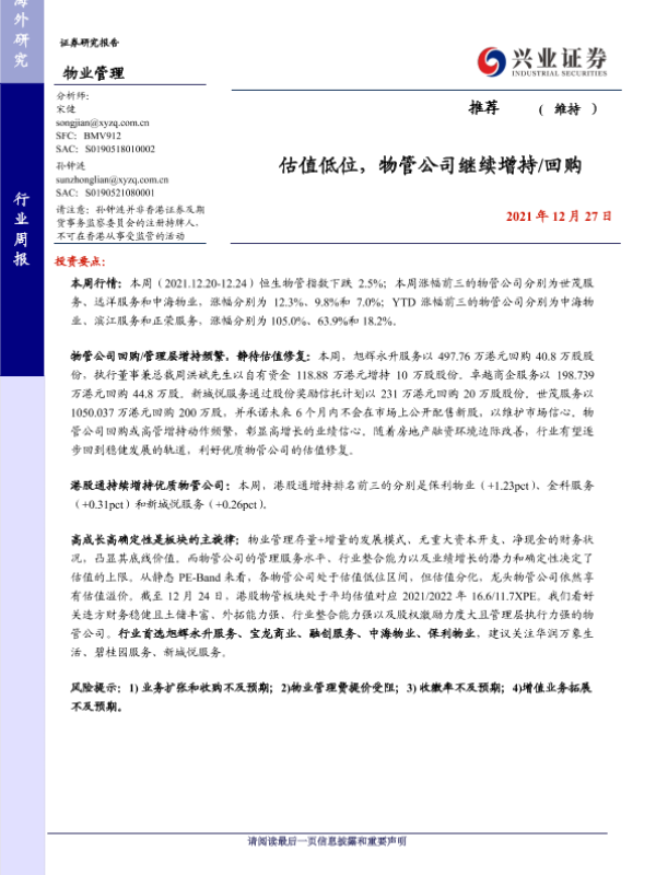 【兴业证券】【20211227】估值低位,物管公司继续增持/回购-9页