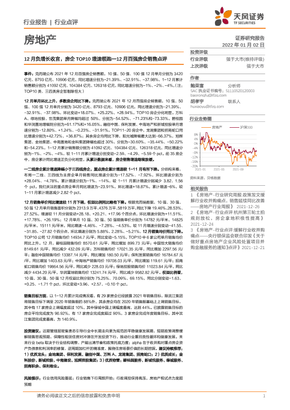 【天风证券】【20220102】12月百强房企销售点评:12月负增长收官,房企TOP10增速领跑-3页