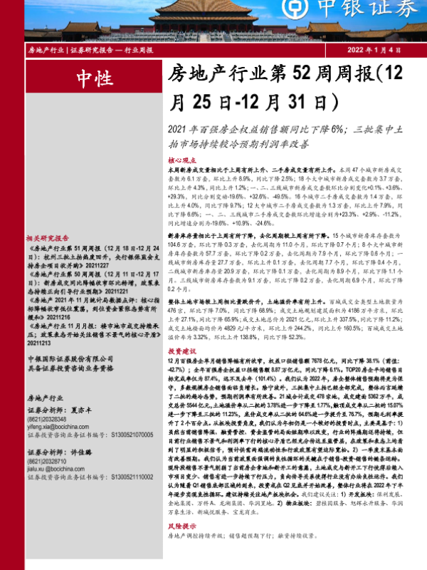 【中银证券】【20220104】2021年百强房企权益销售额同比下降6%;三批集中土拍市场持续较冷预期利润率改善-25页