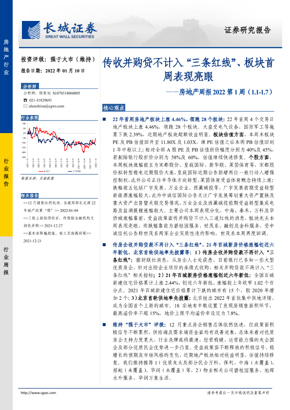 【长城证券】【20220110】房地产周报2022第1周:传收并购贷不计入“三条红线”、板块首周表现亮眼-13页