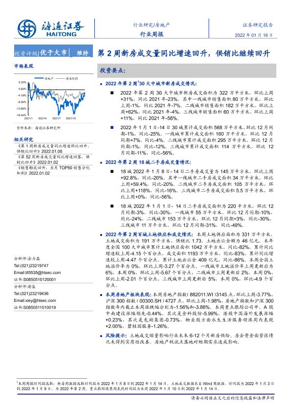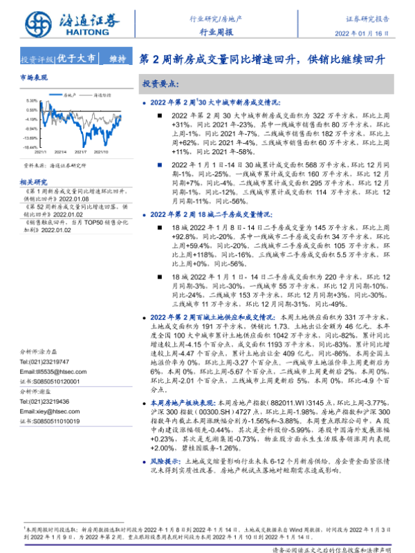 【海通证券】【20220116】第2周新房成交量同比增速回升,供销比继续回升-6页