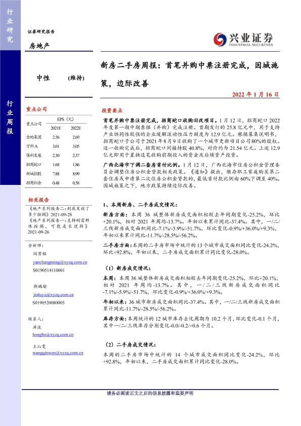 【兴业证券】【20220116】新房二手房周报:首笔并购中票注册完成,因城施策,边际改善-26页