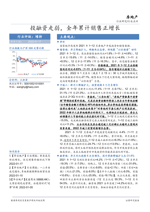 【华安证券】【20220117】房地产:投融资走弱,全年累计销售正增长-3页