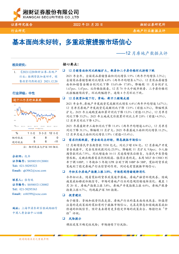 【湘财证券】【20220120】12月房地产数据点评:基本面尚未好转,多重政策提振市场信心-9页