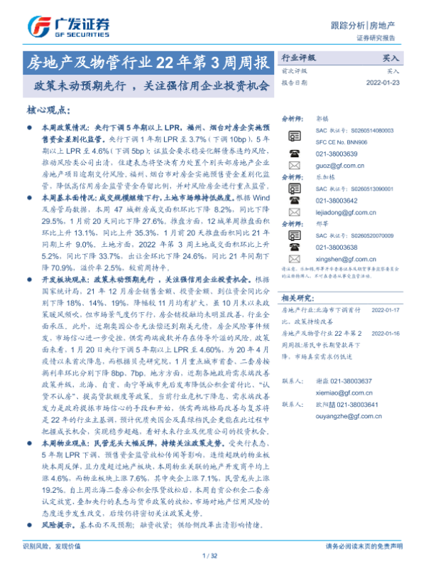 【广发证券】【20220123】房地产及物管行业22年第3周周报:政策未动预期先行,关注强信用企业投资机会-32页