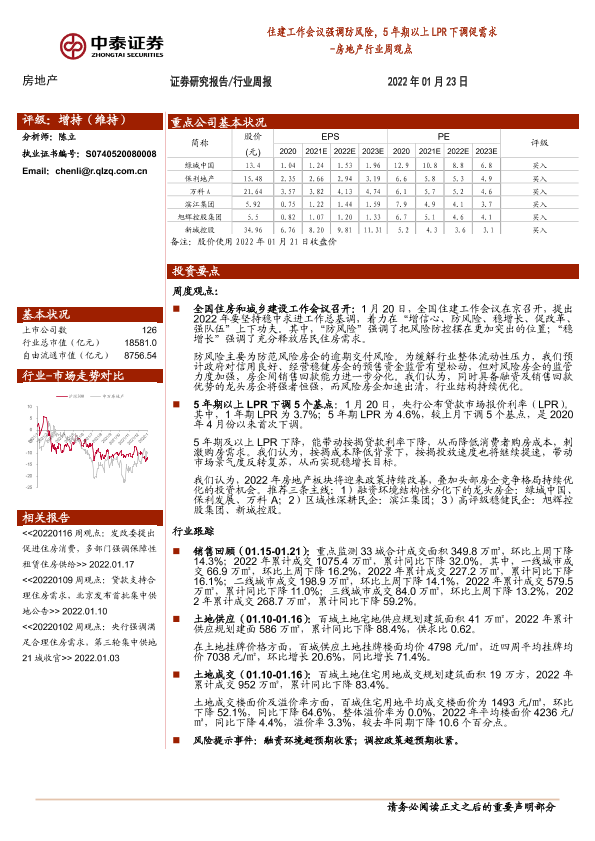 【中泰证券】【20220123】住建工作会议强调防风险,5年期以上LPR下调促需求 - 房地产行业周观点-11页