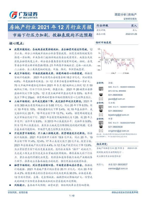 【广发证券】【20220129】房地产行业2021年12月行业月报:市场下行压力加剧,投融表现均不达预期-42页