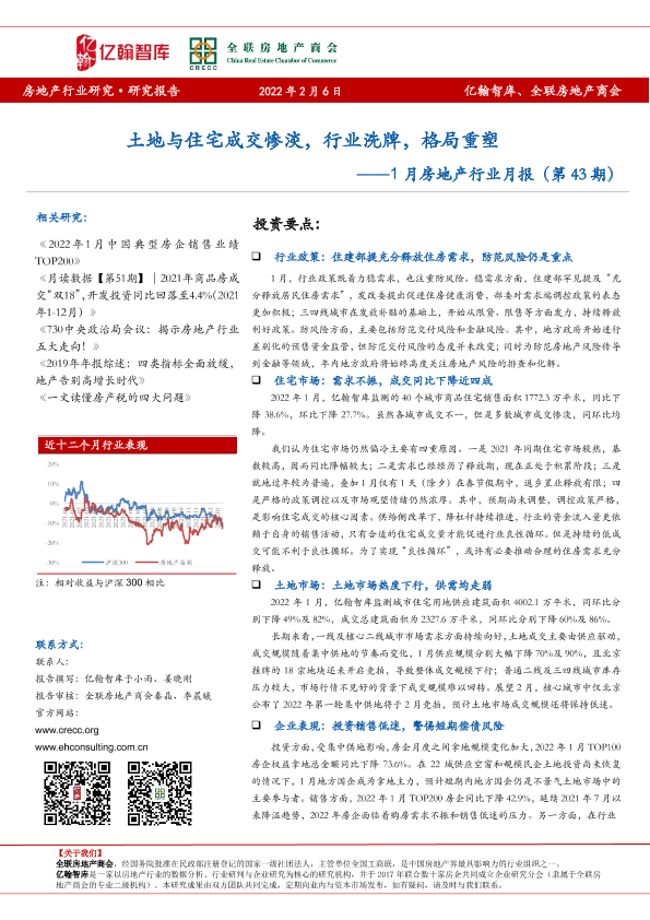 【亿翰智库】【20220206】1月房地产行业月报:土地与住宅成交惨淡,行业洗牌,格局重塑-26页