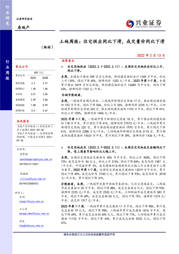 【兴业证券】【20220213】土地周报:住宅供应同比下滑,成交量价同比下滑-10页