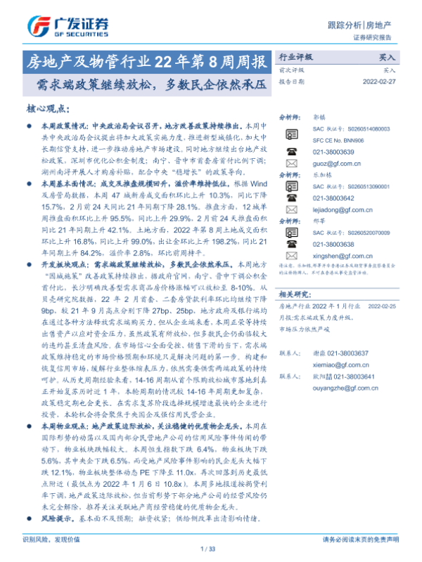 【广发证券】【20220227】房地产及物管行业22年第8周周报:需求端政策继续放松,多数民企依然承压-33页