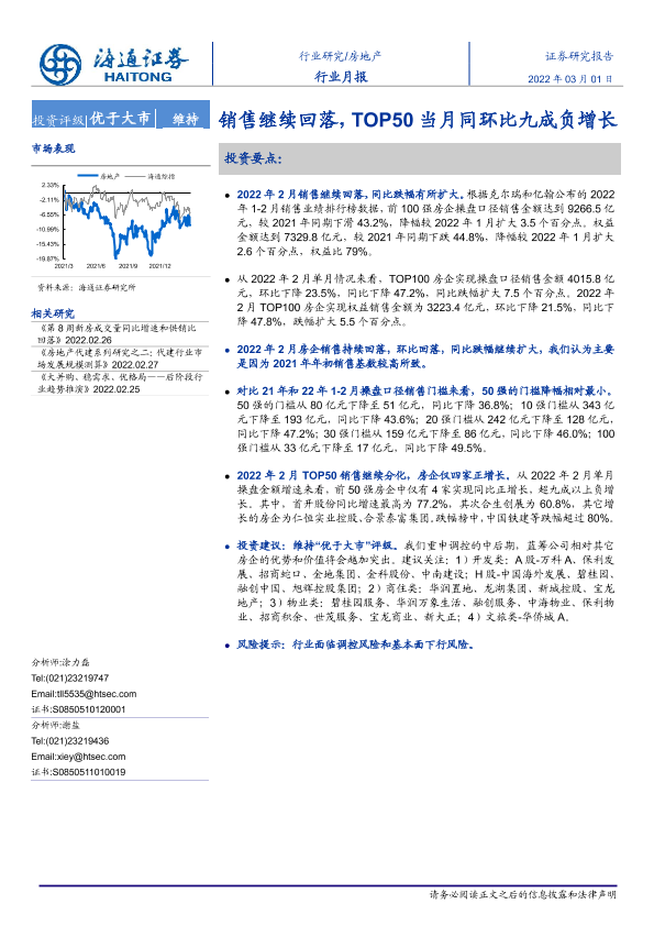 【海通证券】【20220301】房地产行业月报:销售继续回落,TOP50当月同环比九成负增长-10页