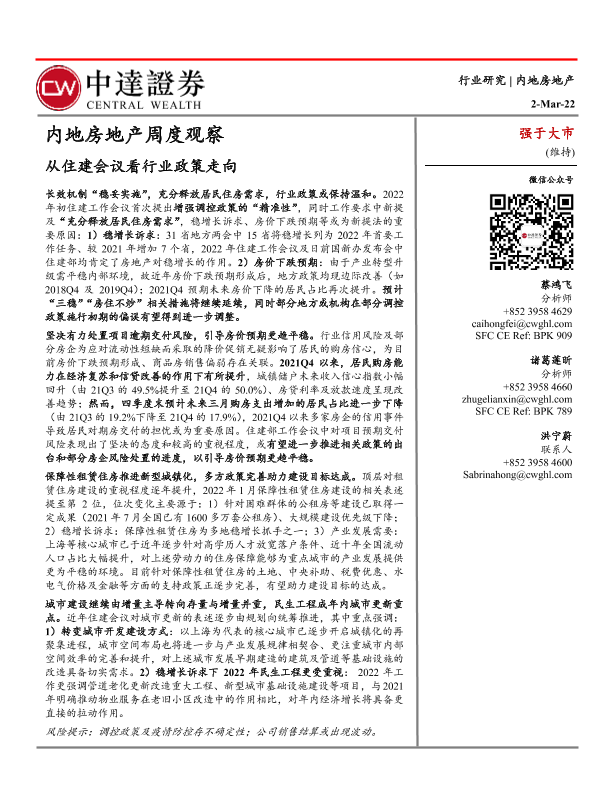 【中达证券】【20220302】内地房地产周度观察:从住建会议看行业政策走向-15页