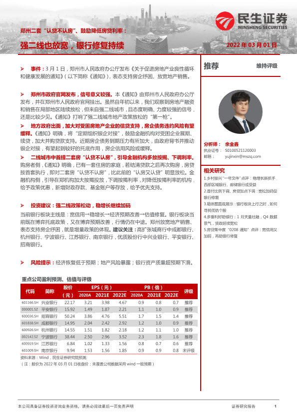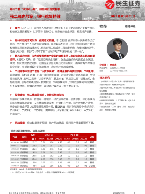 【民生证券】【20220301】郑州二套“认贷不认房”、鼓励降低房贷利率:强二线也放宽,银行修复持续-3页