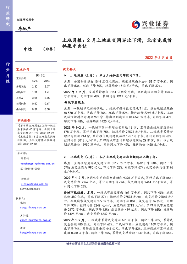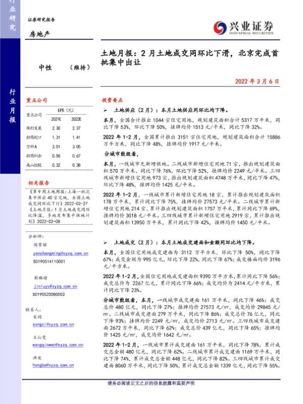 【兴业证券】【20220306】2月土地成交同环比下滑,北京完成首批集中出让-10页