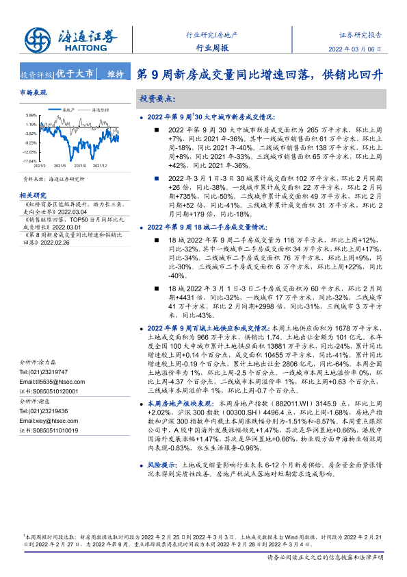 【海通证券】【20220306】第9周新房成交量同比增速回落,供销比回升-6页