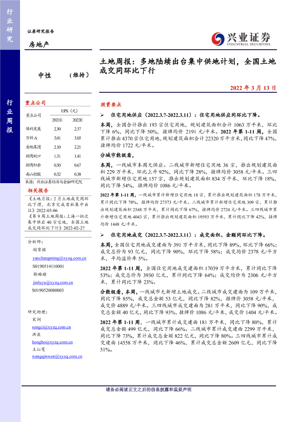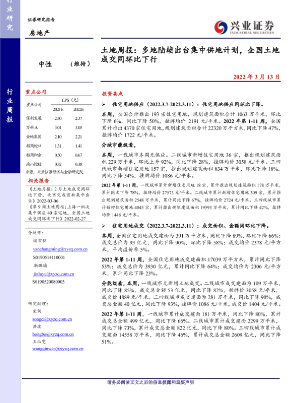 【兴业证券】【20220313】土地周报:多地陆续出台集中供地计划,全国土地成交同环比下行-11页