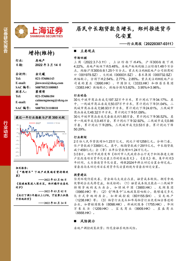 【上海证券】【20220314】房地产行业周报:居民中长期贷款负增长,郑州推进货币化安置-12页
