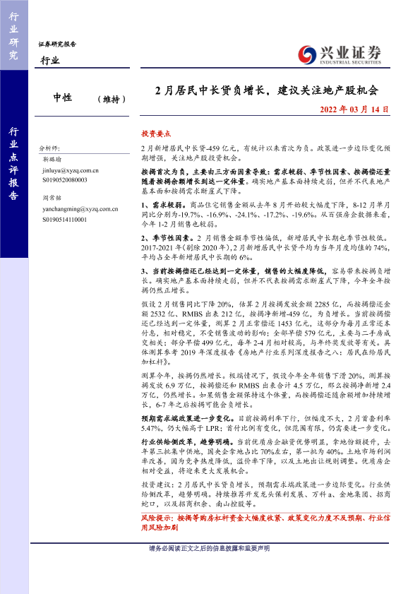【兴业证券】【20220314】2月居民中长贷负增长,建议关注地产股机会-2页