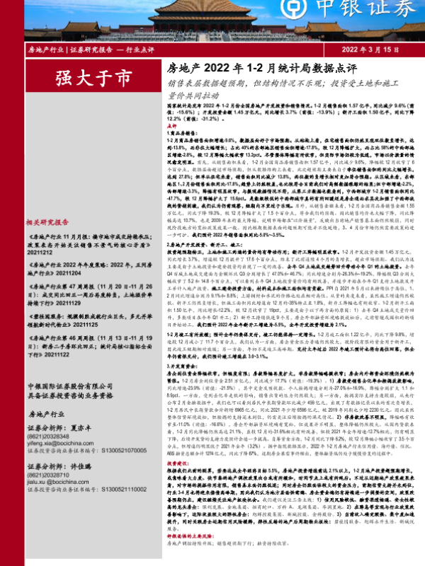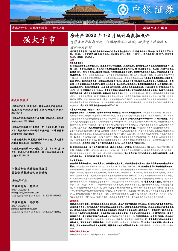 【中银证券】【20220315】房地产2022年1-2月统计局数据点评:销售表层数据超预期,但结构情况不乐观;投资受土地和施工量价共同拉动-6页