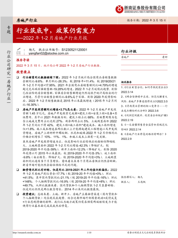 【浙商证券】【20220315】2022年1-2月房地产行业月报:行业筑底中,政策仍需发力-10页