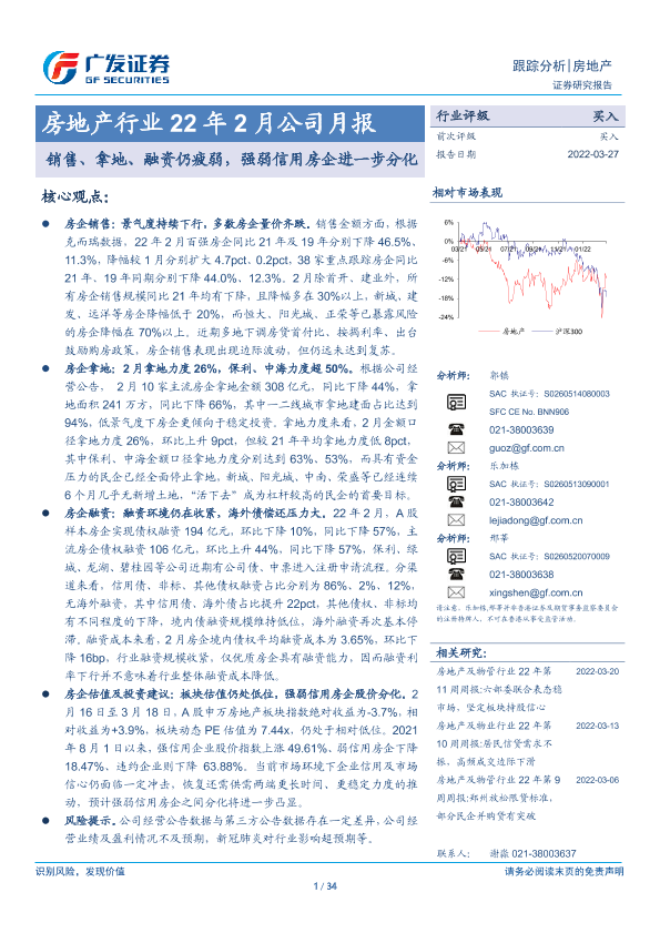 【广发证券】【20220327】房地产行业22年2月公司月报:销售、拿地、融资仍疲弱,强弱信用房企进一步分化-34页