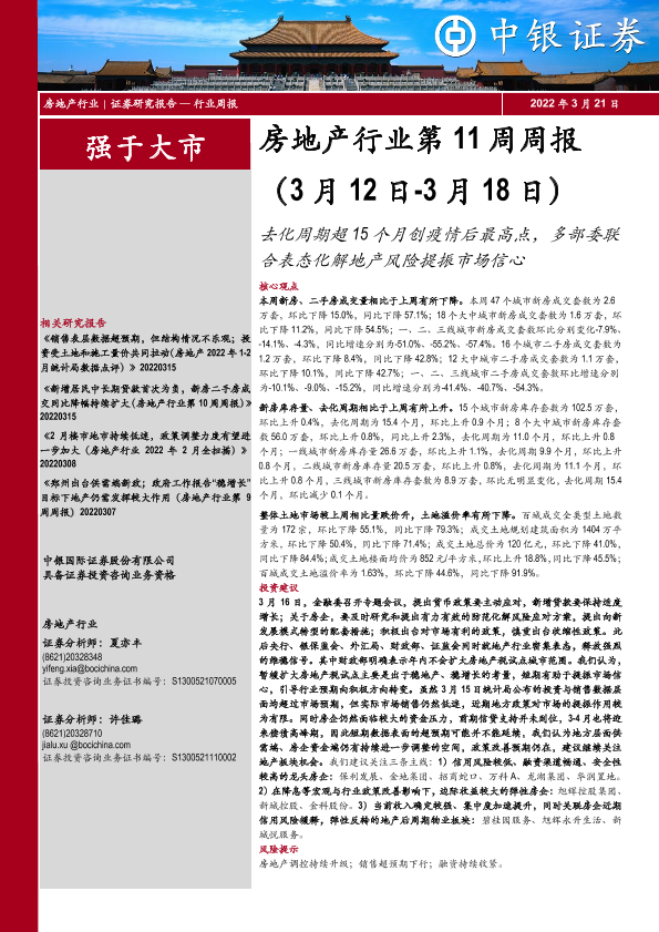 【中银证券】【20220321】房地产行业第11周周报:去化周期超15个月创疫情后最高点,多部委联合表态化解地产风险提振市场信心-25页