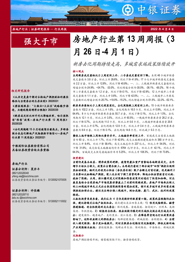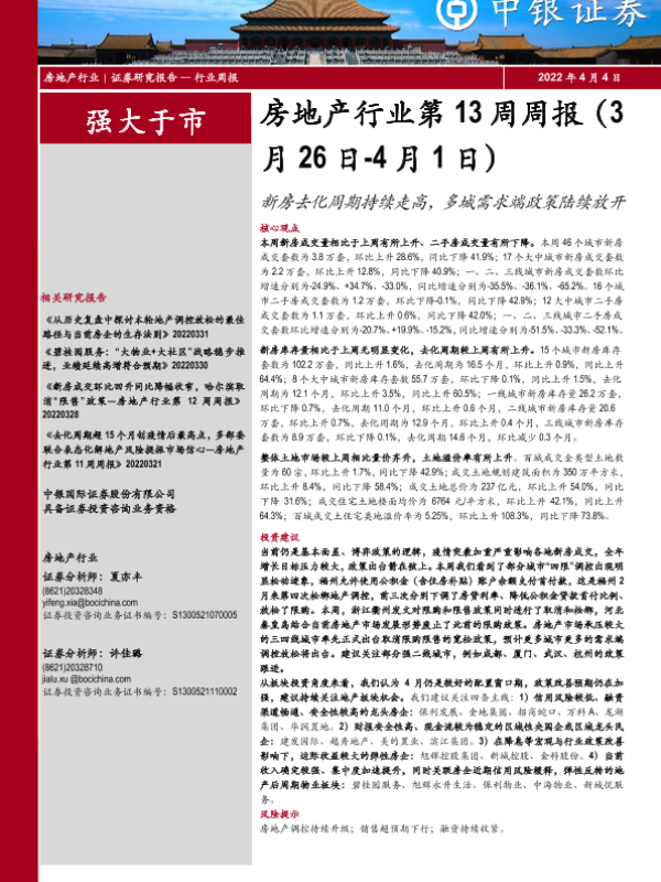 【中银证券】【20220404】房地产行业第13周周报:新房去化周期持续走高,多城需求端政策陆续放开-25页